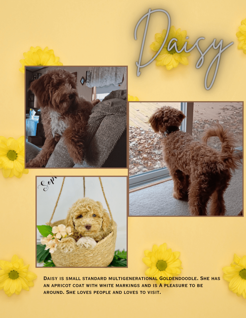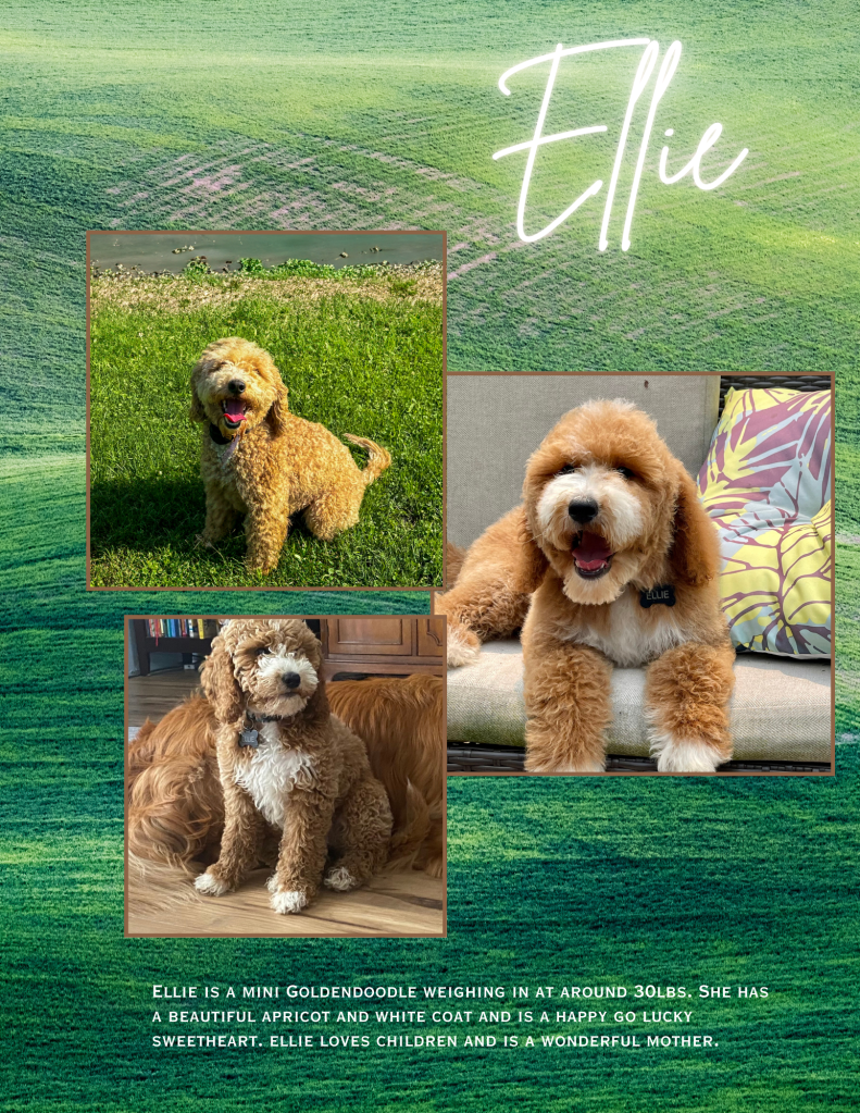 Cooper an F1 mini goldendoodle who weighs around 30lbs. He has a loyal, friendly, and easy going temperment. His color traits are ee Bb kyky atat SS. His father is our mini poodle Red.