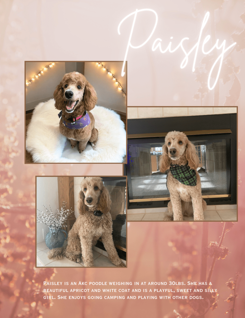 Levi is an AKC red/white parti poodle. He is around 40lbs and is a very well behaved boy. He lives with a local guardian family.